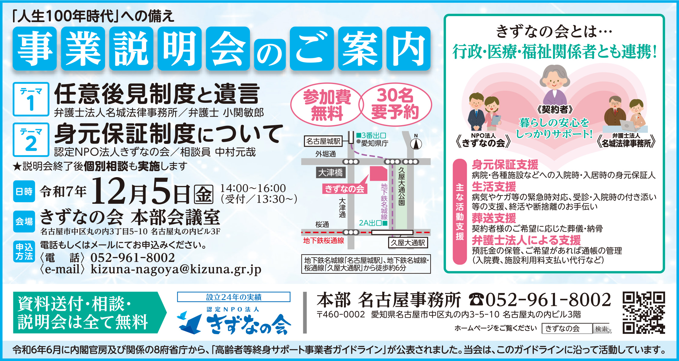 申込方法:【電話】052-961-8002 または、【メール】kizuna-nagoya@kizuna.gr.jp
