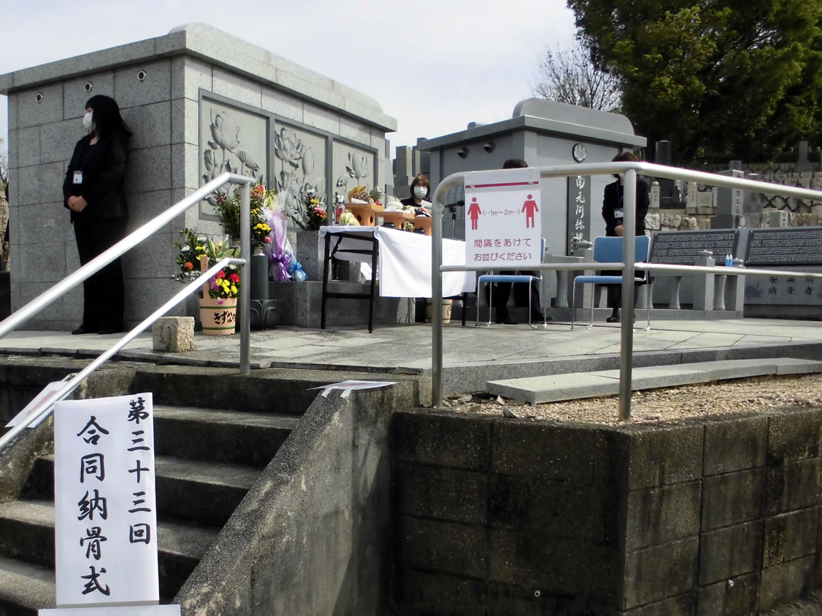 今回の合同納骨式はもともと4月に開催予定でしたが、新型コロナウイルスの影響で延期になり、10月の開催となりました。参列者様、職員ともにマスクの着用、検温、手指の消毒などの対策を徹底し、密を避けるため、お経をあげていただいている間に順次お参りしていだたく流れとなりました。今までとは多少異なる形の合同納骨式でしたが、大きな混乱もなく穏やかに執り行われました。