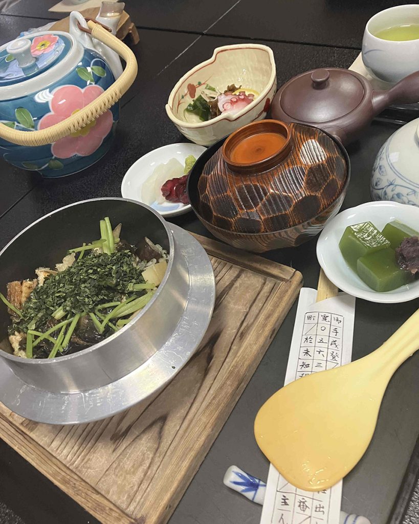 最初の目的地「抹茶ミュージアム西条園和く和く」では、抹茶を作る工程の説明を聞き、実際に和菓子と一緒に抹茶をいただきました。次は「日本料理 魚寅」で昼食です。