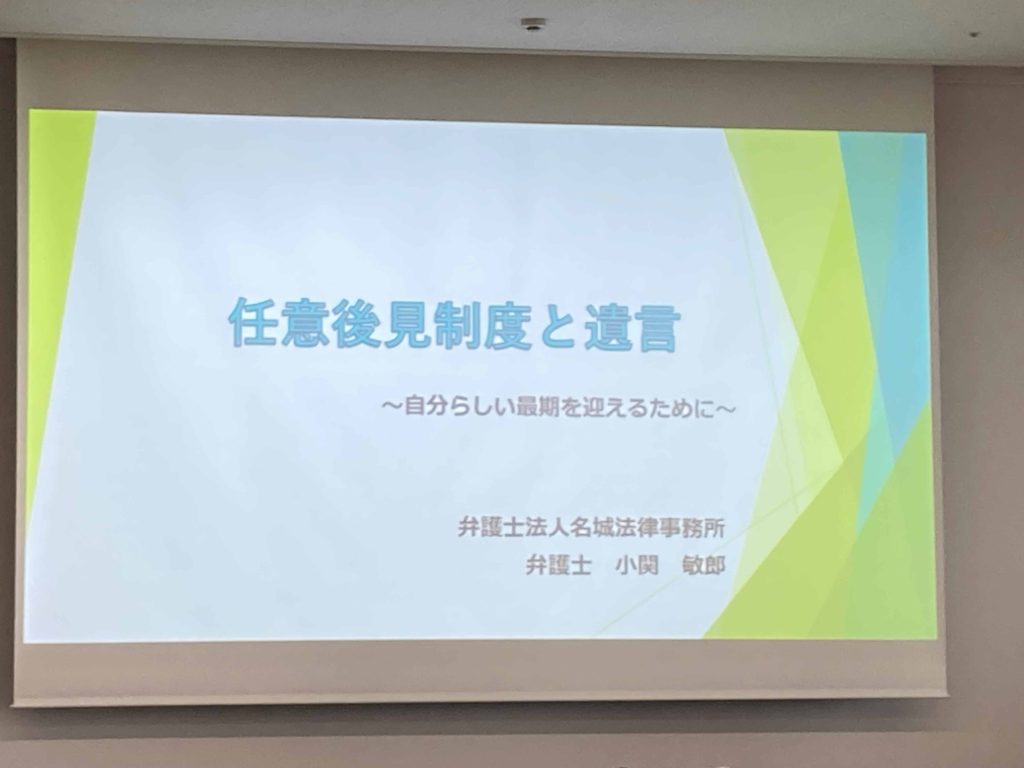 講師として名城法律事務所の小関敏郎弁護士をお迎えし、自分らしい最期を迎えるための「任意後見制度と遺言」をテーマに講義していただきました。