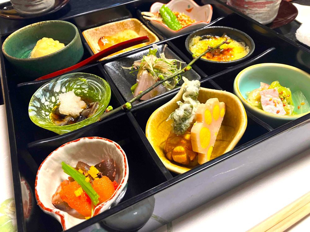 ビル街の中とは思えない庭を備えた趣のあるお店で、お料理は先附の紅梅餡のスープ蒸し(茶碗蒸しのような)、趣向を凝らした小鉢料理の数々を堪能しました。