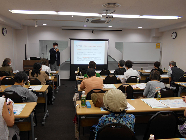 はじめに弁護士法人名城法律事務所 井口弁護士から「後見制度」「遺言」など何かあった時の備えについてのお話があり、次にきずなの会大阪事務所所長 大橋から「身元保証支援」「生活支援」「葬送支援」等のきずなの会の支援内容を説明させていただきました。