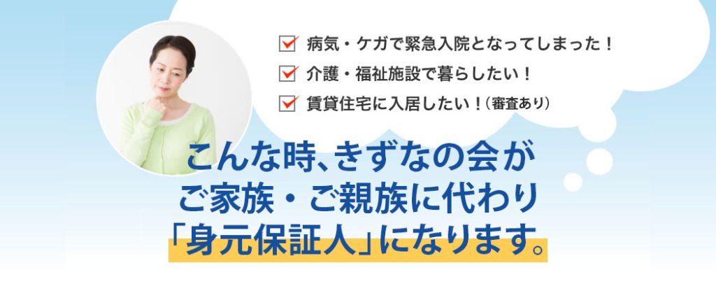 認定NPO法人きずなの会は、入院時や高齢者施設入居時などに「身元保証人」を確保できない場合、ご家族・ご親族に代わり「身元保証人」をお引き受けします。