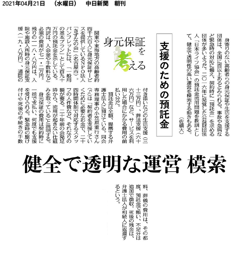 本日、中日新聞朝刊「介護・シニア 身元保証を考える」に当会が取り上げられました。