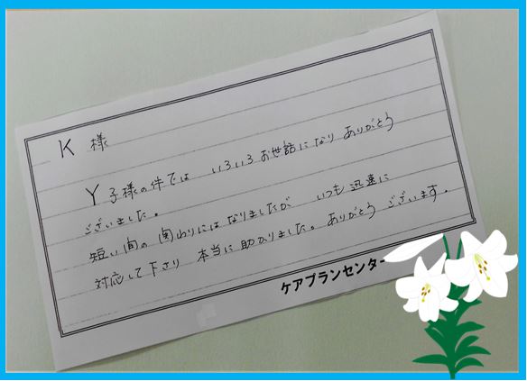 後日、ケアマネジャー様からお礼のお手紙をいただき(下記参照)改めて、これからも会員様に寄り添いながら関係機関の皆様と共に、お役に立てるよう頑張りたい、と強く思いました。